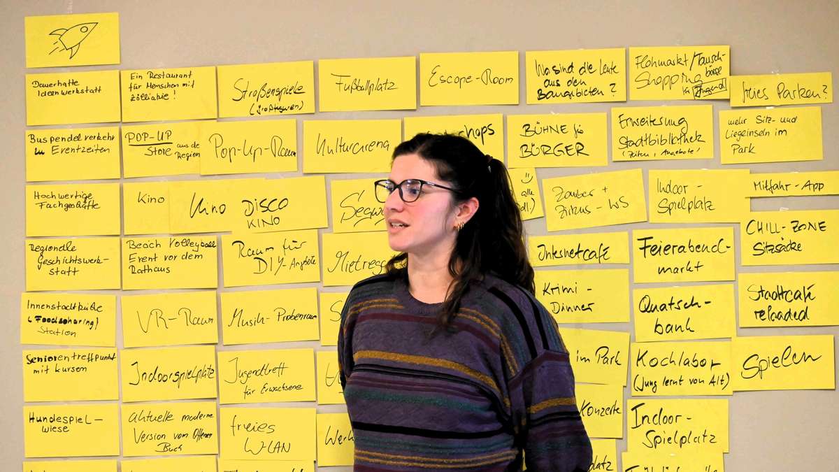 From bouncy castles to cinemas to nonsense benches – numerous citizens from Hünfeld collected lots of ideas for the inner city laboratory at a workshop.