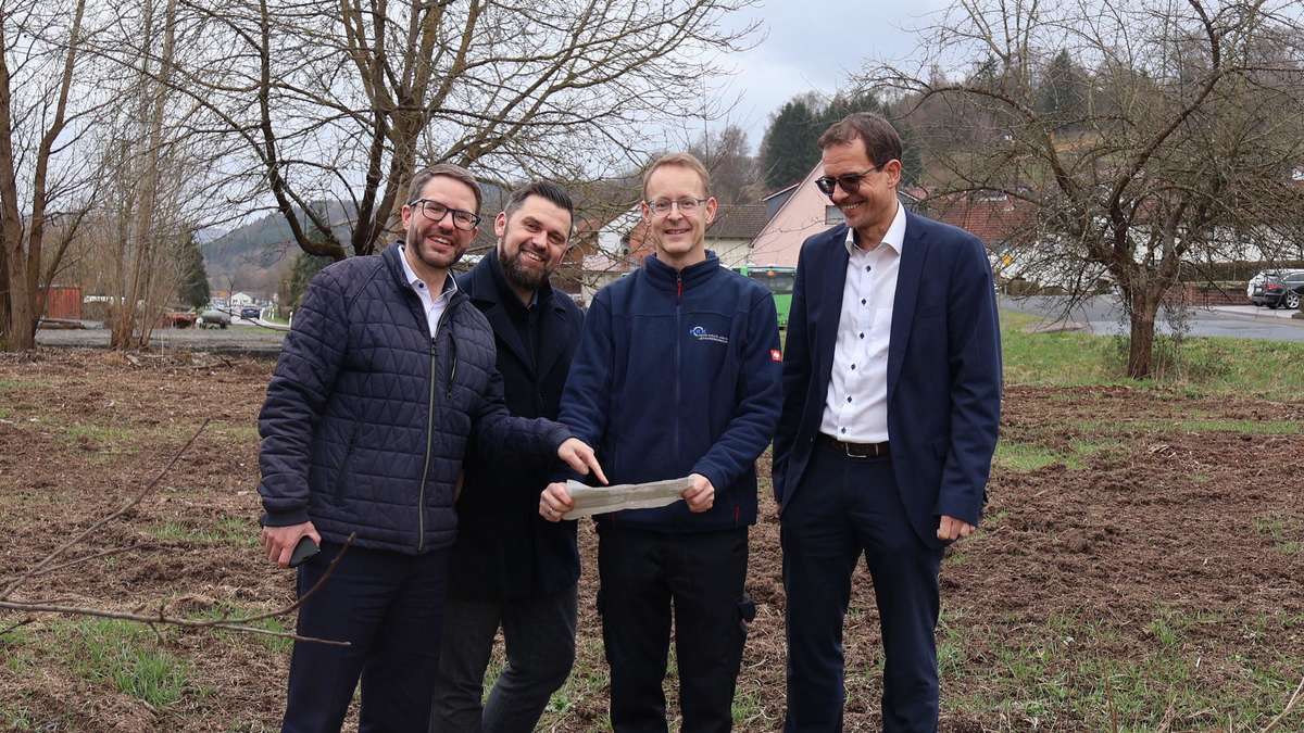 At an on-site visit, District Administrator Thorsten Stolz, Mayor Thomas Henfling, Dr. Manuel Wilhelm, medical director of the emergency services, and district council chairman Carsten Ullrich inspect the property, which is located directly on the L2304 road. The budget has earmarked 2.3 million euros for the construction project.