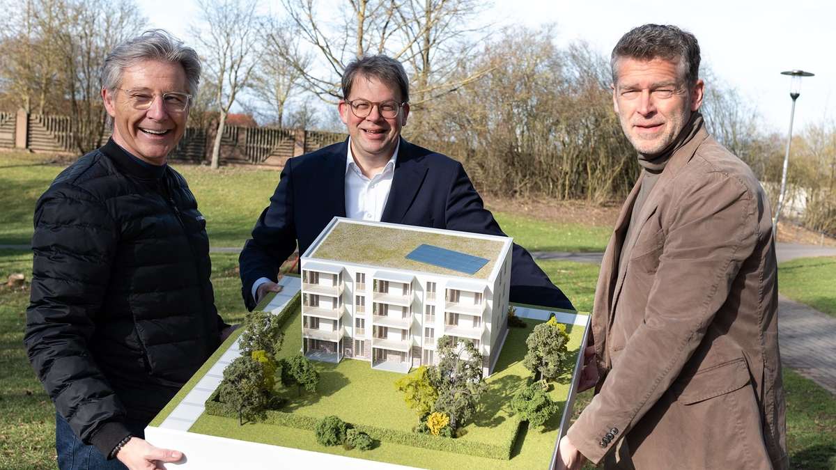 Proudly presenting the model of the GWH Hessenhaus in Ziehers-Süd (from left): GWH CEO Stefan Bürger, Mayor Heiko Wingenfeld and GWH Bauprojekte Managing Director Christian Wedler.