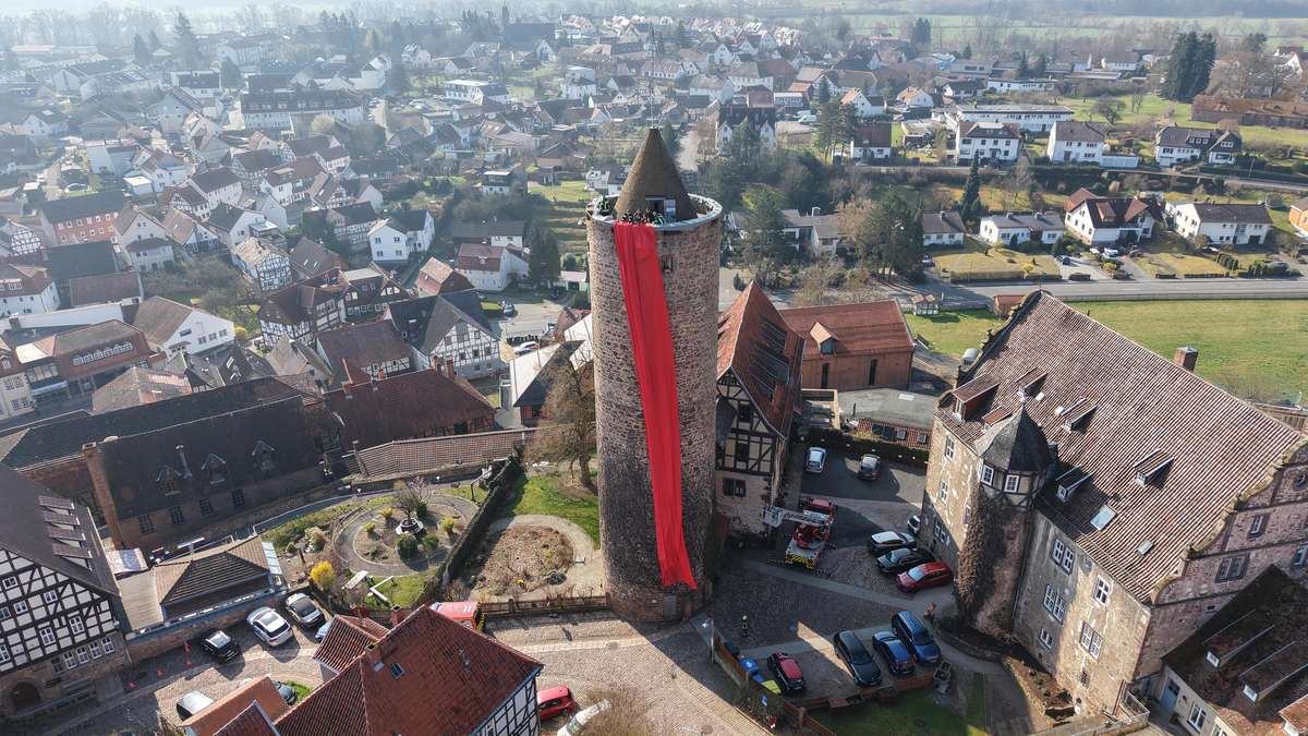 Schlitz – On Saturday morning (March 21st), volunteers from the Schlitz fire department removed the cloth that turns the historic back tower into the “largest candle in the world” every year. As those responsible announced, the red cover will now be safely stowed away until November.