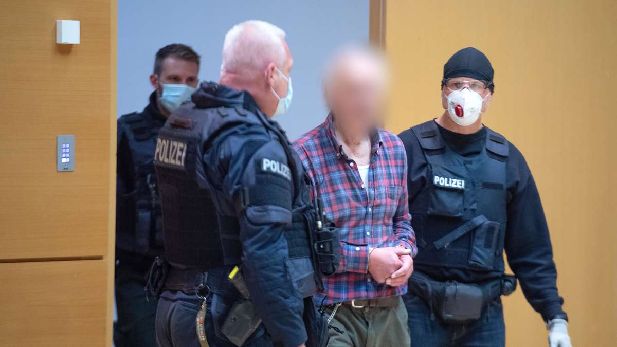 Trial against the father of the Hanau attacker. He is led into the hearing room by police officers.
