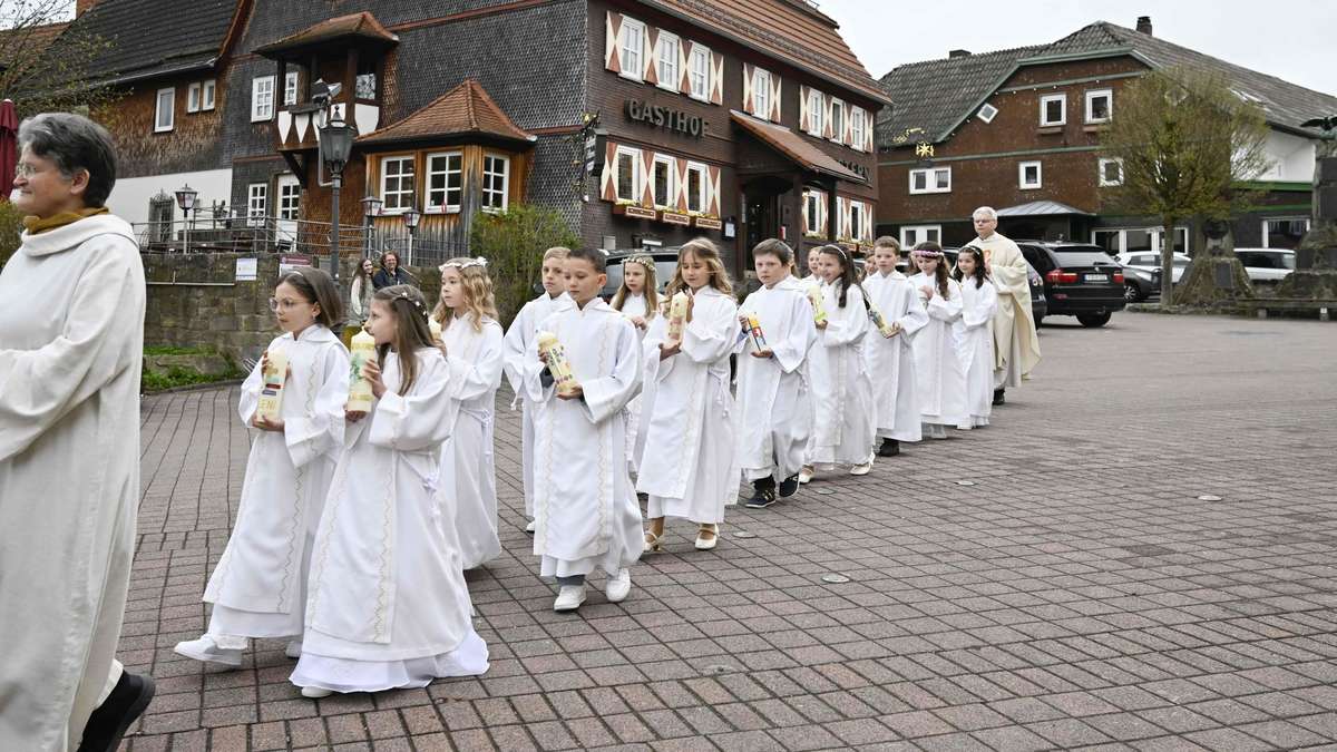 Poppenhausen – On White Sunday, the first Sunday after Easter, children celebrate their first communion in many places – like in Poppenhausen, where the photo for our article was taken. 18 children received Holy Communion – the “Bread of Life” – and thus the Body of Christ for the first time. Numerous families celebrated today in the region.